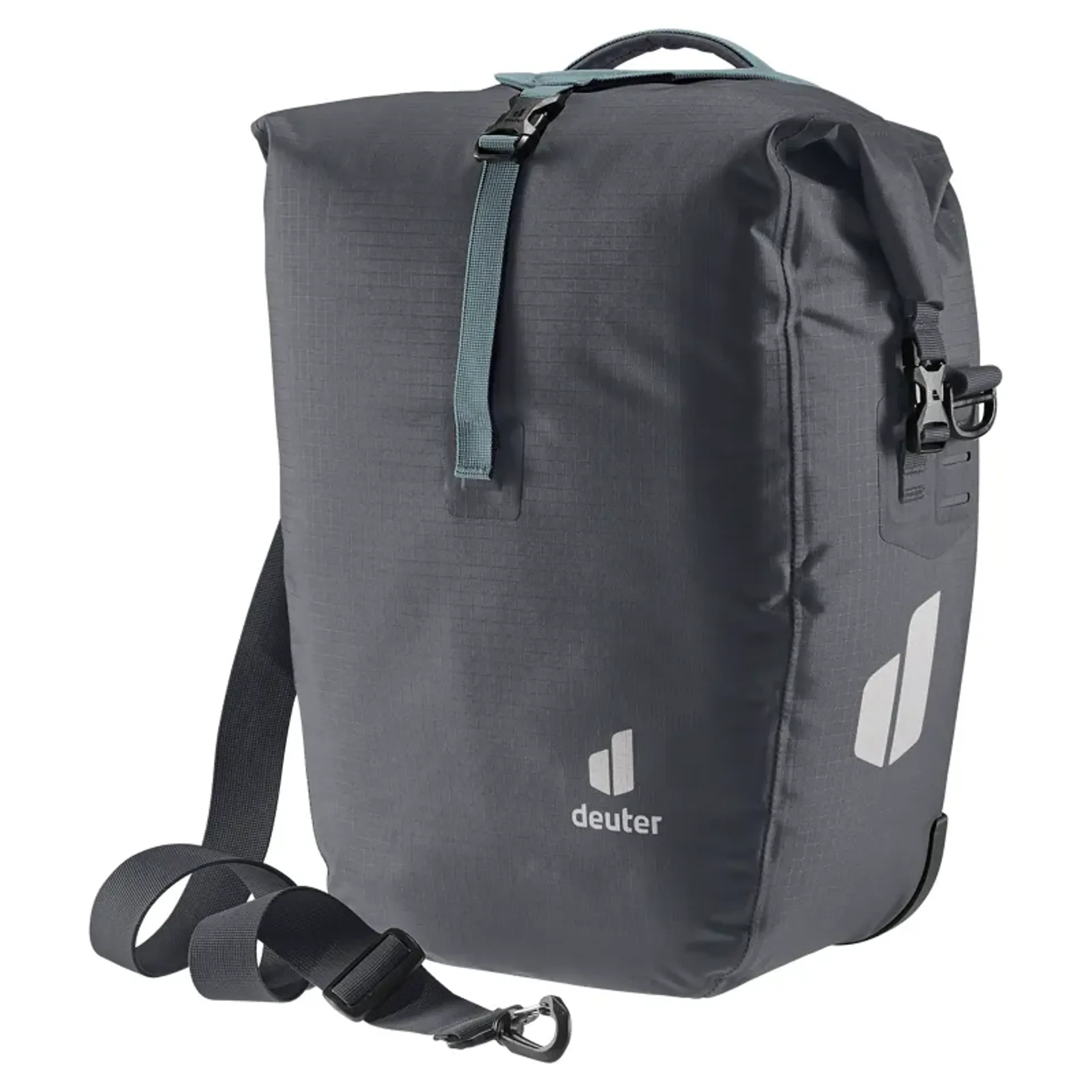 The roll-top closure with two-way zipper lets you extend the capacity by 5 liters. deuter’s newly developed BagFix quick-release system leaves you free to pedal in peace, with the bike bearing the brunt of the load – and nothing on your back. A quick pull on the release handle and the bag is detached and ready to use as a shoulder bag. And with a detachable shoulder strap and an adjustable grab handle / closure strap that doubles as a gear strap to attach a sleeping mat or jacket, plus a built-in organizer unit, the sky’s the limit for what this bag can do.